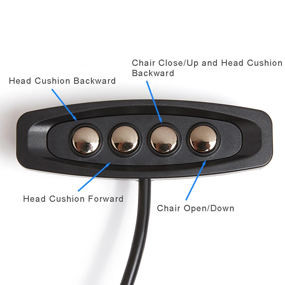 - The switch has four buttons, it operates the head cushion backward and forward; chair open/close (up/down).