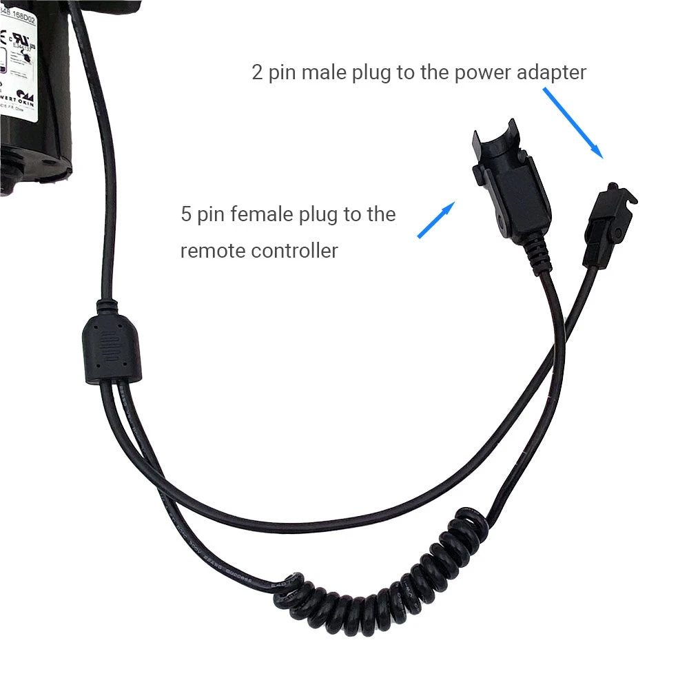 - This actuator has 2 cables and plugs, the male 2 pin plug connects to the power adapter, the female 5 pin plug connects to the